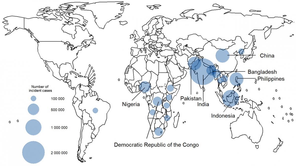 Los países se clasifican como endémicos, cuando la incidencia es >100 casos/100 000 habitantes/año y no endémicos, cuando la incidencia es <20 casos/100 000 habitantes año (figura 40.2).