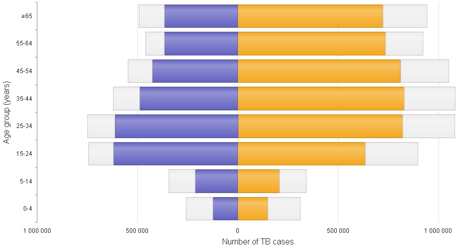 La mayor carga se concentra en hombres adultos (≥15 años), con una estimación de 6,0 millones de casos en 2023, equivalente al 55·% del total; en comparación, con 3,6 millones de casos de mujeres adultas (≥15 años), equivalente al 33 % del total, y 1,25 millones de casos entre niños (0–14 años), equivalente al 12 % del total estimado. Las notificaciones de casos de personas con diagnóstico reciente de tuberculosis en 2023 representaron el 75 % del total, pero la incidencia varía según la edad y el sexo, 76 % en hombres adultos, 80 % en mujeres adultas y 55 % en niños de 0 a 14 años (figura 40.3).