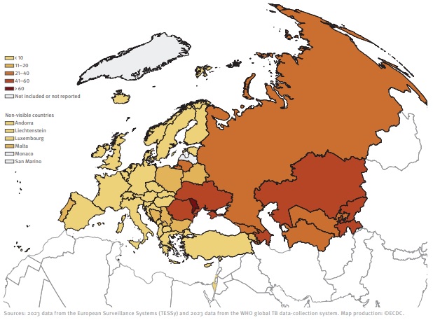 Fuente: ECDC. Tuberculosis surveillance and monitoring in Europe 2025 (Datos de 2023).