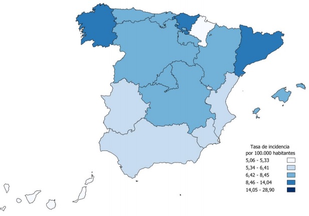 Las CC. AA. que presentaron tasas por encima del tercer cuartil en 2023 (superior a10,3) fueron: Ceuta (28,9), Melilla (14,0), Cataluña (12,3), Galicia (11,2) y País Vasco (10,9). En la figura 40.5, se representa la distribución por comunidades autónomas.