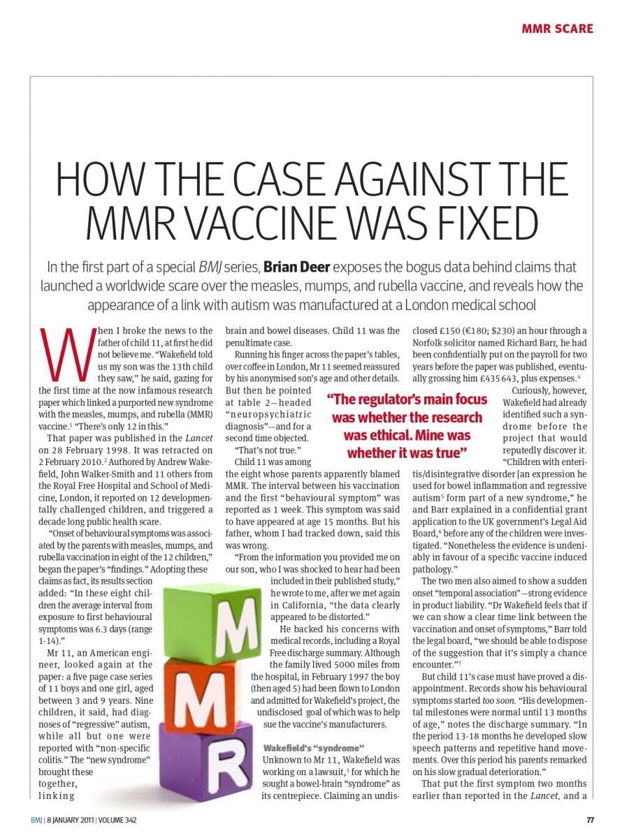 En enero de 2011, el British Medical Journal (BMJ) inició la publicación de una serie de artículos de Bryan Deer, donde este detallaba todo el proceso y las mentiras desparramadas por Wakefield desde años antes. También en la web de Deer se detalla la aportación de BMJ. Las publicaciones de BMJ fueron: