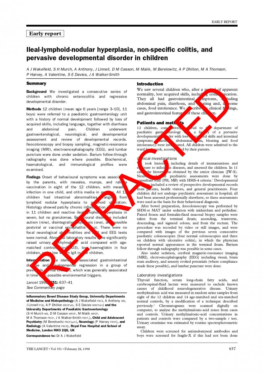 El 28 de febrero de 1998, The Lancet publicó un artículo titulado “Ileal-lymphoid-nodular hyperplasia, non-specific colitis, and pervasive developmental disorder in children”, firmado por A. J. Wakefield, S. H. Murch, A. Anthony, J. Linnell, D. M. Casson, M. Malik, M. Berelowitz, A. P. Dhillon, M. A. Thomson, P. Harvey, A. Valentine, S. E. Davies y J. A. Walker-Smith (Wakefield AJ, Lancet 1998). Wakefield tenía entonces 41 años.
